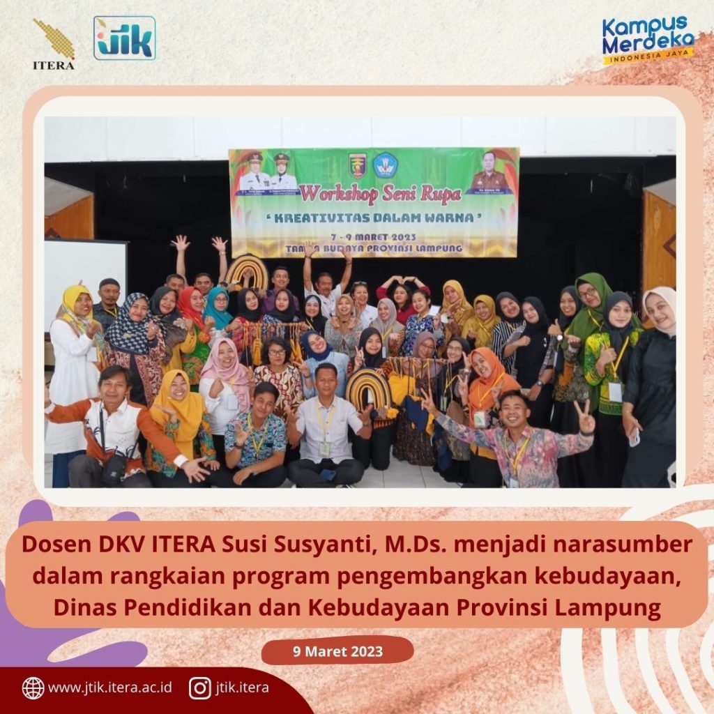 Dosen DKV ITERA Susi Susyanti, M.Ds. menjadi narasumber dalam rangkaian program pengembangkan kebudayaan, Dinas Pendidikan dan Kebudayaan Provinsi Lampung yaitu Workshop macrame bersama guru setingkat SMK-SMA seni rupa se-Provinsi Lampung.
