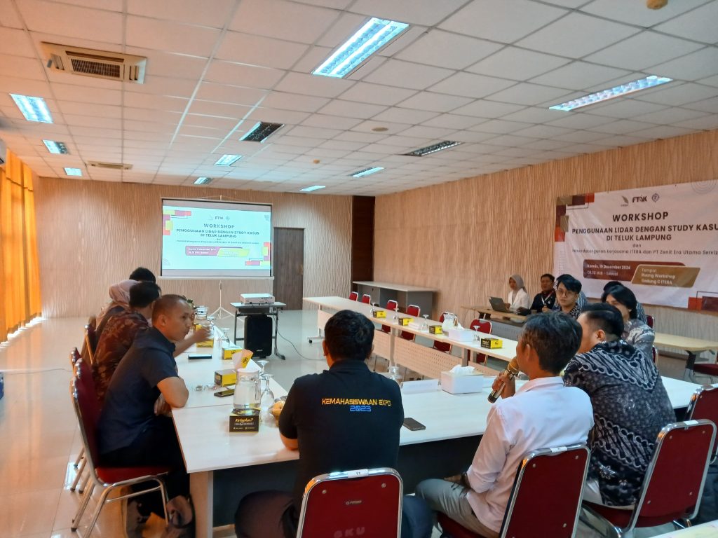 Fakultas Teknologi Infrastruktur dan Kewilayahan (FTIK) Institut Teknologi Sumatera (ITERA) sukses mengadakan Workshop Penggunaan LiDAR dengan Studi Kasus di Teluk Lampung.Pada tanggal 19/12/2024Â Acara yang berlangsung di Ruang Workshop Gedung C ITERA ini dihadiri oleh Dekan, Wakil Dekan Bidang Keuangan dan Umum, Kepala Sub Bagian Umum, koordinator laboratorium, dosen, laboran, tenaga kependidikan, serta tim dari PT Zenit Era Utama Servizio.